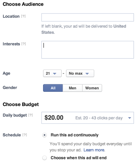 To the right, you'll be able to target your ad by location, interests, age, and gender. Beneath these options, you'll be able to set your budget & schedule the duration of your ad's run time.