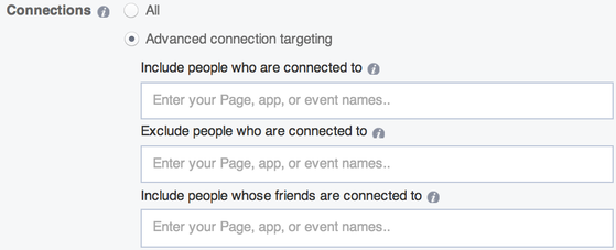 Last, but not least, you can target your ads to audiences connected to your page, app, or events or those not connected to any of those.